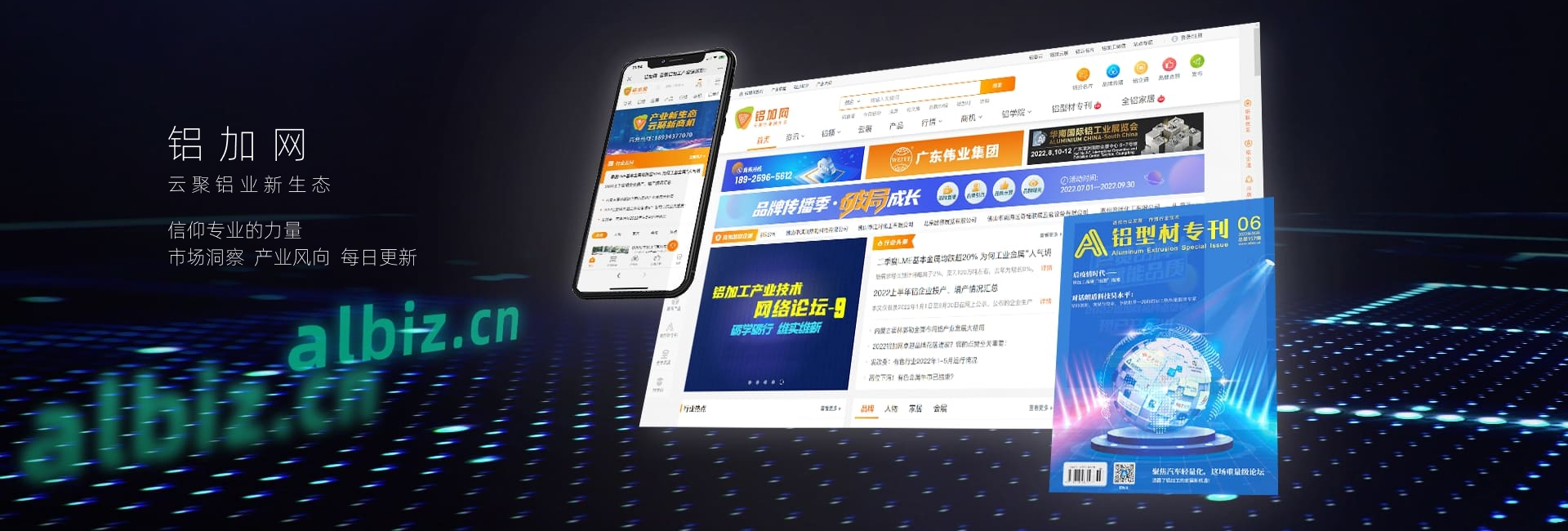 铝加网(网址www.albiz.cn)创建于2008年,是闻名铝加工行业的垂直门户网站,由在有色金属行业拥有20年经验的广东南海鹏博资讯有限公司专业运营。铝加网以albiz.cn网站为核心,以移动端、铝加工微信、铝加网视频号、《铝型材专刊》和《铝世界》杂志为载体,采集和发布全行业信息资讯,提供线上展览、在线直播、短视频、品牌策划、品牌运营、品牌传播等全方位的专业服务。网站拥有专业的技术、运营和营销团队,以及丰富的客户资源、专家资源和协会资源,日均访问量达20万以上,是铝加工行业访问用户与商机总量领先的平台之一。自建网以来,铝加网始终秉承“关注行业发展,促进行业交流”的初心,伴随着从“制造”到“智造”的产业浪潮不断自我迭代,从单一的资讯平台发展为集媒体、电商、社群、智库于一体的行业生态服务平台,并依托100余位行业专家组成的智库,成功支持并引领了如“广东(南海)铝加工产业技术大会”等顶级行业盛会。