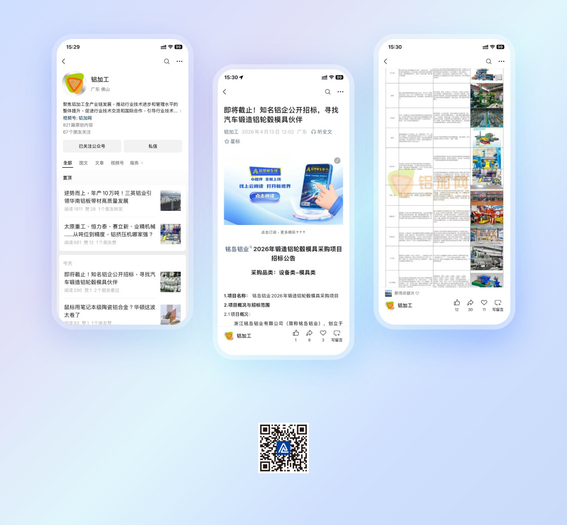 “铝加工”微信公众号。聚焦铝加工全产业链发展,推动行业技术进步和管理水平的整体提升,促进行业技术交流和国际合作,引导行业技术创新,促进节能减排,促进行业技术标准化水平提高。